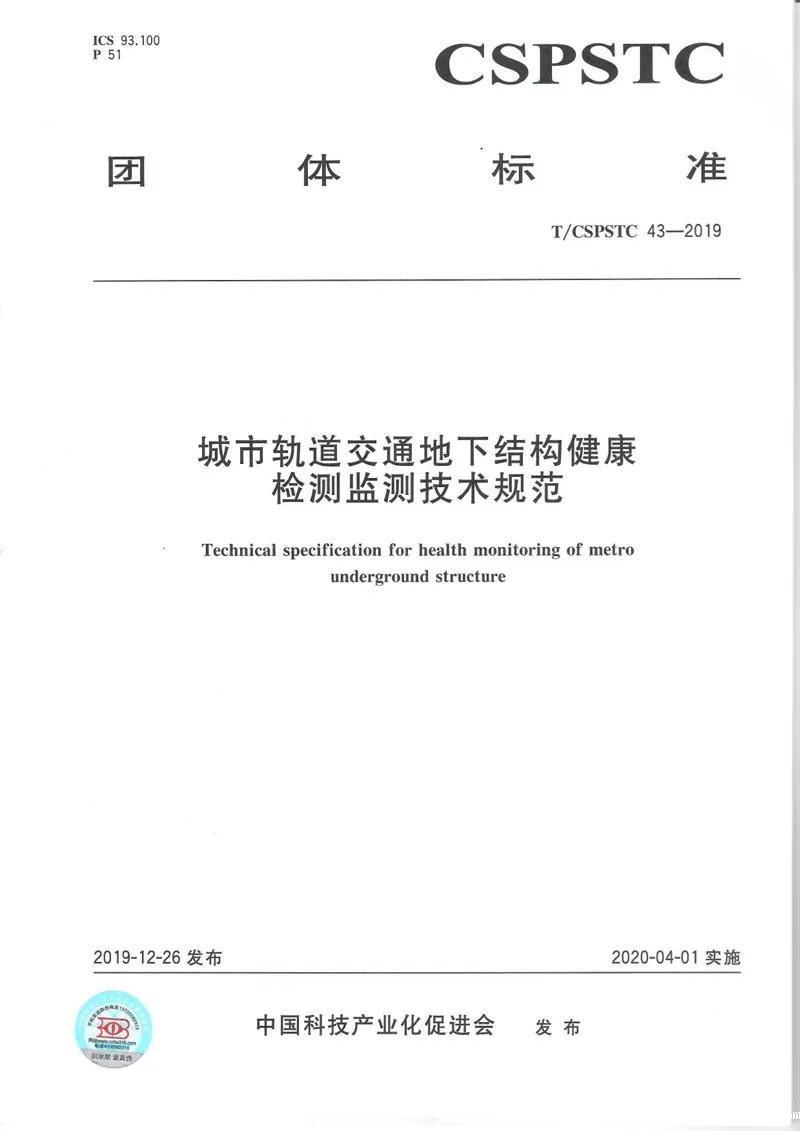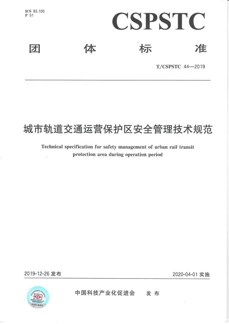 2019年12月26日,中国科技产业化促进会正式发布《城市轨道交通运营保护区安全管理技术规范》(编号:T/CSPSTC 44-2019)和《城市轨道交通地下结构健康检测监测技术规范》(编号:T/CSPSTC 43-2019)团体标准,已于2020年4月1日开始实施。
