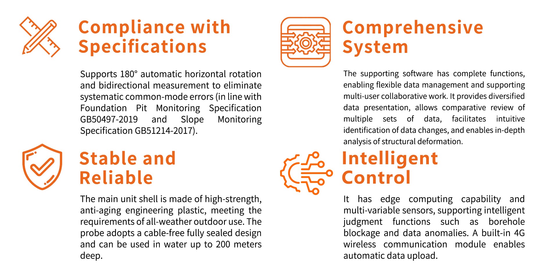 The lifting device and the probe are connected by a high-strength traction rope instead of cables, which significantly reduces the equipment weight. Meanwhile, combined with wireless charging and transmission technology, the probe can adopt a fully sealed design to enhance its deep-water waterproof performance. When the lifting motor rotates, it drives the rope to control the probe's movement up and down in the inclinometric hole, thereby completing continuous measurement at 0.5-meter intervals. After the probe is lifted into the rotating device, the rotating motor can be used to control the probe to rotate 180 degrees, realizing two measurements (forward and reverse) as required by national monitoring technical standards and specifications (GB50497-2019, GB51214-2017) for slopes, foundation pits, etc. The difference between the two measurements is calculated to eliminate systematic common-mode errors.