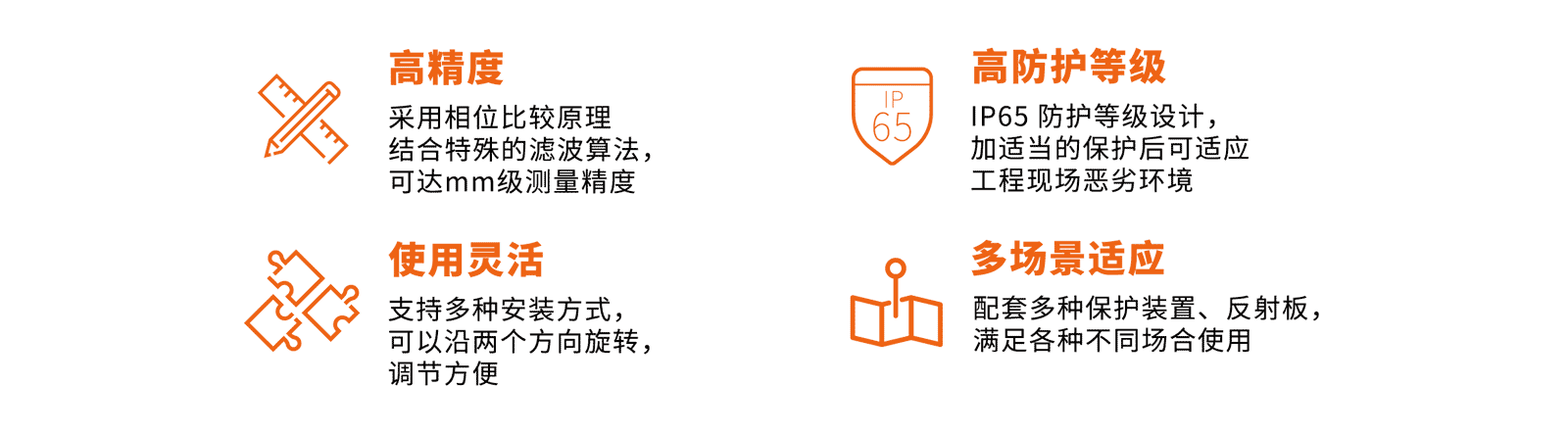 高精度,体积小,高防护等级,安装方便。