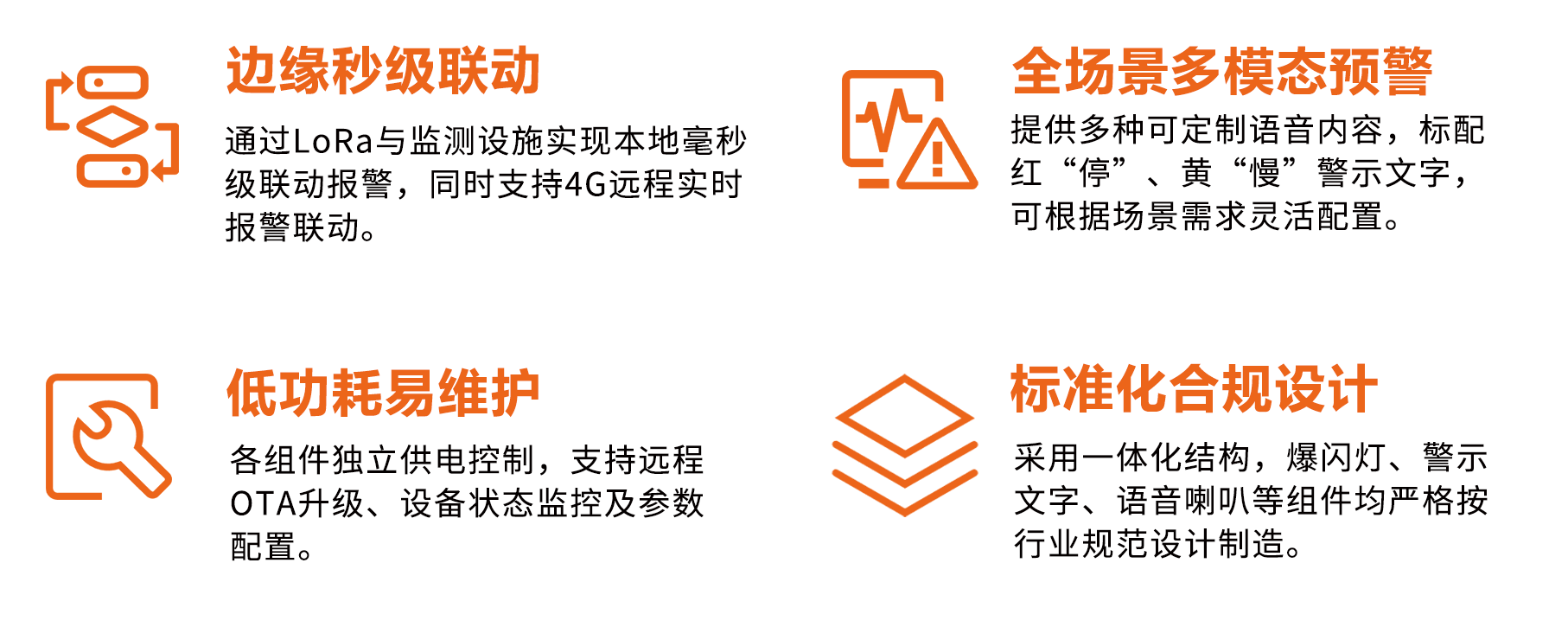 该设备采用模块化设计,集成双色爆闪灯(2蓝2红)、红黄警示文字、语音播报系统和LED显示屏等预警组件,可根据实际需求选择多种模式,实现灯光警示、文字提示、语音播报和信息显示等各种预警功能。
