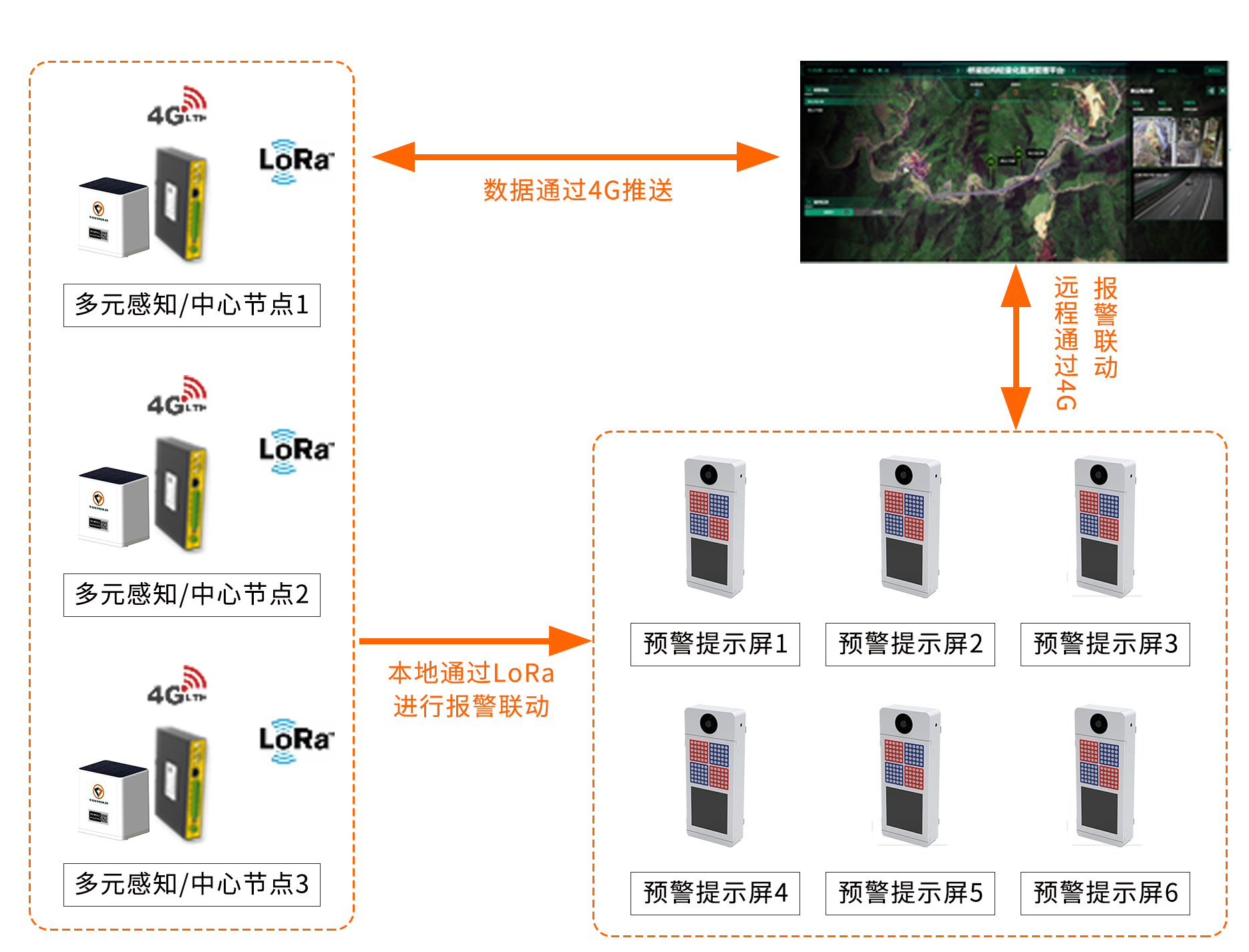 智能预警提示屏配置多功能网关,内置4G模组和LoRa模组,既能实时响应远程管理平台指令,又可与本地监测设施快速联动,实现毫秒级报警。