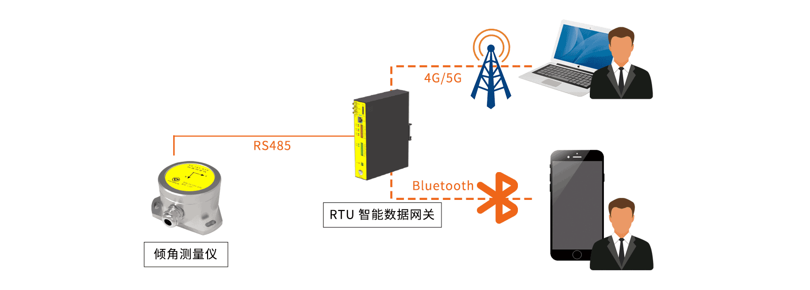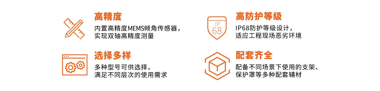 倾角测量仪内置高精度MEMS倾角传感器并配套相应的数据采集电路和软件程序,最终通过RS485接口输出倾角值,可以测量多个方向上的倾角变化。