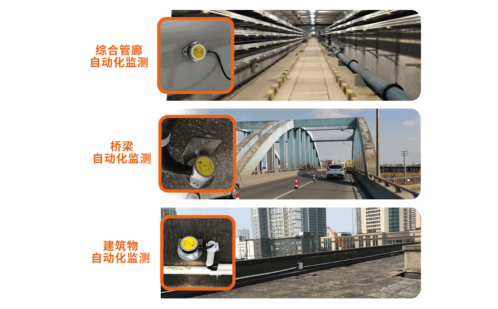 本产品安装于结构物表面,可应用于边坡、大坝、建筑物、桥梁、隧道、管廊等结构物的倾斜监测。
