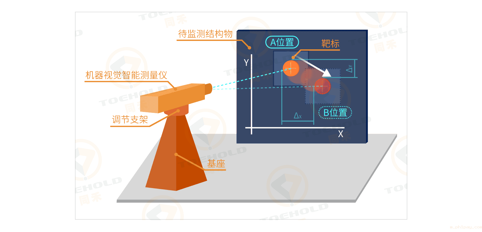 在待测结构物上布设若干靶标,在相对结构物稳定的位置安装机器视觉智能测量仪,机器视觉智能测量仪识别结构物上的靶标图像,当被测结构物发生平面位移时,靶标坐标随之变化,从而测量到被测物的水平与垂直双向位移。