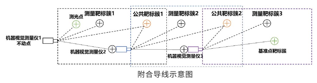 在长距离隧道测量或者长距离、大弧形水库大坝的测量中,用单台机器视觉智能测量仪进行监测存在单个相机的机器视觉监测系统受限于图像采集设备的视场,难以覆盖整个监测结构物范围的问题。采用“机器视觉传递测量技术“可以解决以上难题,通过多台测量仪前向传递的方式,形成附和测量导线,并结合测量仪转点测算算法,实现长距离或曲线测量。