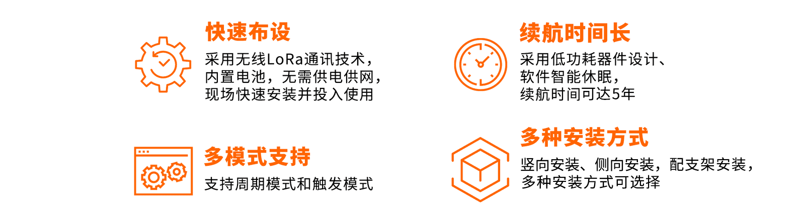 该产品采用一体化设计,内部集成了电池和无线传输模块,可在供电供网不便的场合下快速安装使用。