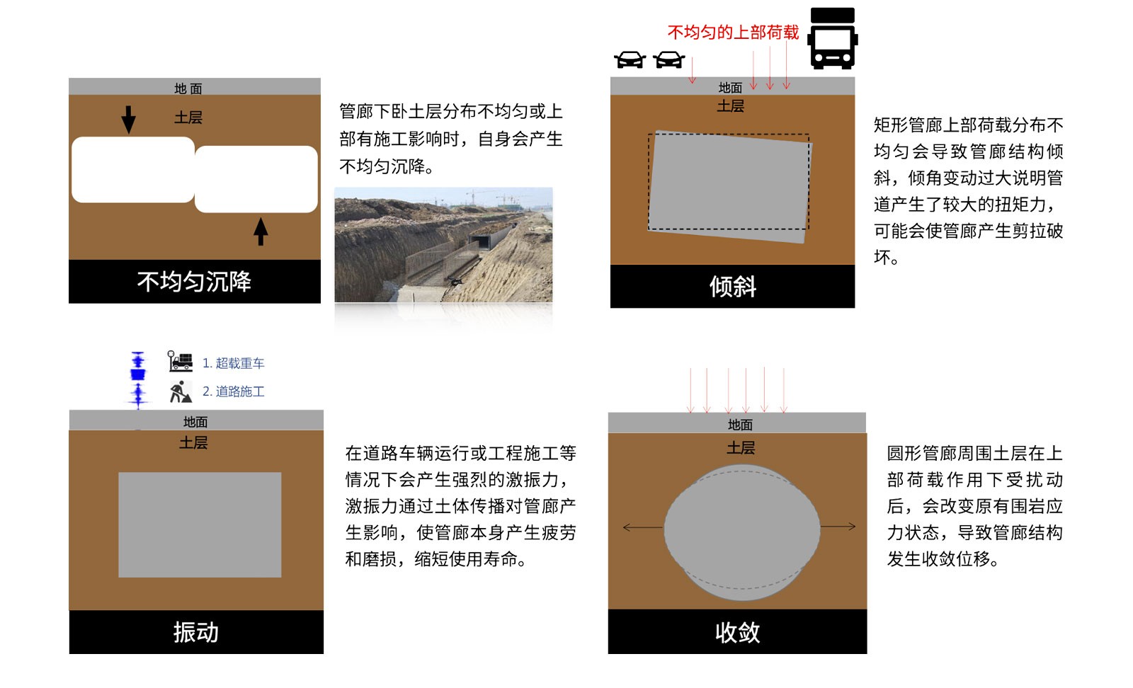 综合管廊一般浅埋于地表以下,易受人为环境和自然环境影响,出现混凝土开裂、不均匀沉降、水平错动等诸多问题。这些问题不仅会削弱混凝土的耐久性,还会对管廊内附属的各类管线造成不良影响,引发安全事故。因此,对综合管廊进行实时健康监测,确保其安全稳定运行非常必要。