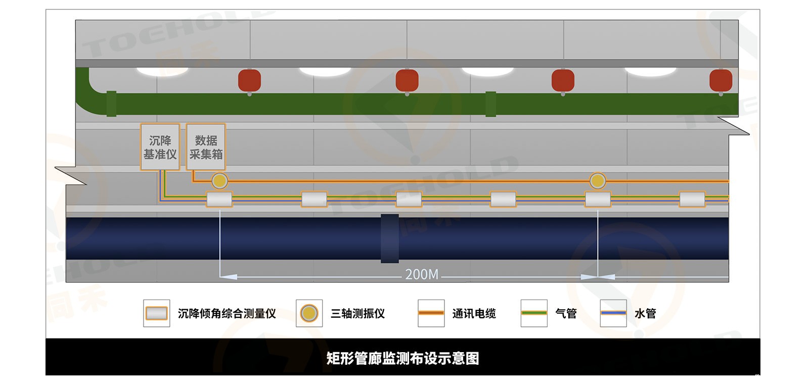 该综合管廊监测项目是市政重点施工项目,包含多个区段,管廊总长约15km,该项目共设291个压差沉降测点,232个倾角测点,97个三轴振动测点,5台通用数据采集箱。