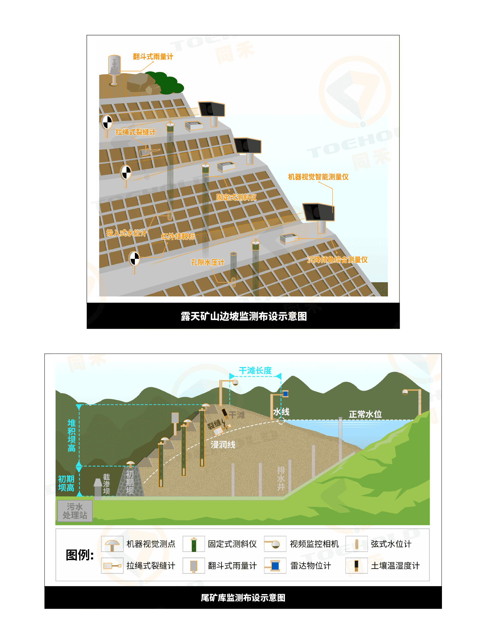 根据尾矿库溃坝成因分析,确定主要监测内容为坝体表面位移、深层水平位移、坝体裂缝、库水位、干滩长度、浸润线、降雨强度及视频监控。