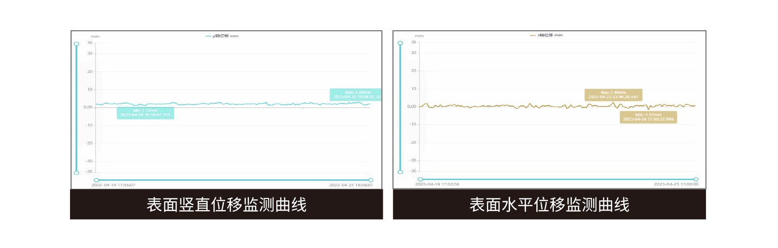 监测系统自安装以来,设备运行稳定,矿山边坡表面竖直、水平位移波动值在5mm以内,且累计变形未出现不收敛现象,该矿山总体处于健康状态,无明显的过大变形。