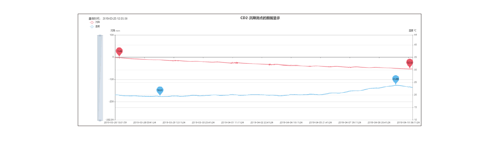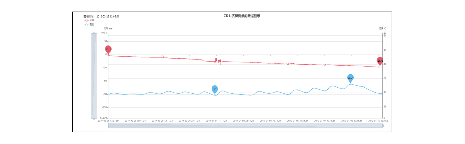 CD1、CD2从2019.3.25开始到2019.4.10,累计变化量分别为28.01mm、52.16mm,日变化量分别为1.87mm、3.48mm,沉降变形曲线为线型,变形趋于稳定发展。