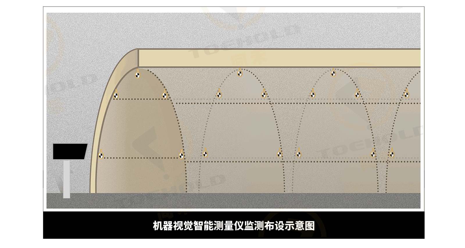 项目监测区间150m,采用4台机器视觉智能测量仪进行接力测量。共安装4台测量仪、48个监测靶标、4个测光点及2个转点靶标。