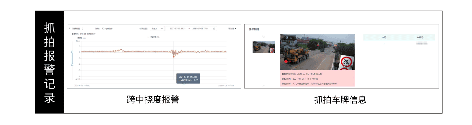 该桥梁于2021年7月5日14点54分08秒出现机器视觉智能测量仪监测的跨中挠度报警,随即启动上部抓拍摄像机。视频显示该时刻有一辆汽车驶过桥梁,荷载超标,系统成功抓拍车牌照片并识别车牌。