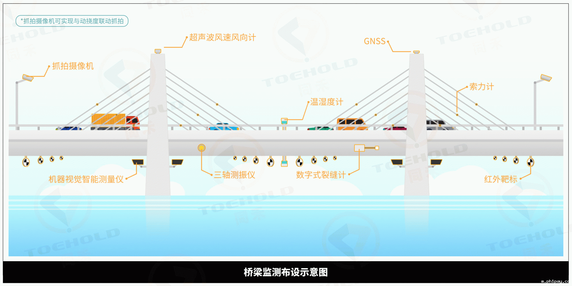 动挠度测点主要布设在主跨的跨中部位,梁底布设,每断面布设4-8个测点;超载抓拍布设在桥面人行道对应部位,同时对所有车道进行超载抓拍。