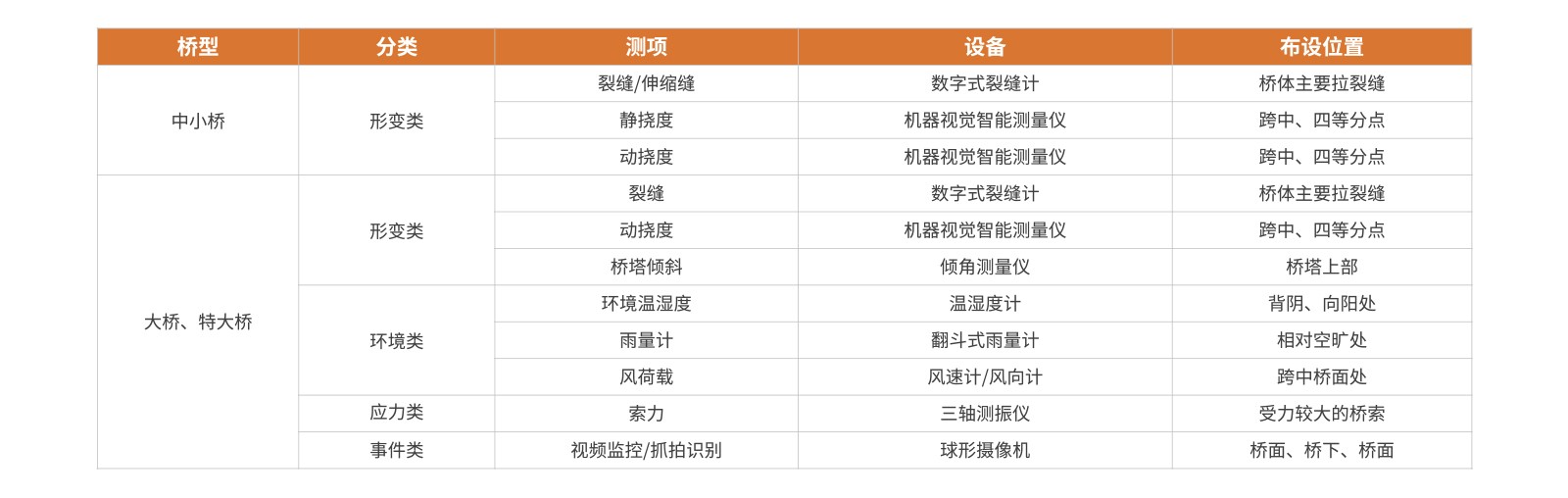针对大桥、特大型桥梁,除裂缝、挠度必须监测外,还应对桥塔倾斜、索力、风速风向、雨量、环境温湿度、车流量等进行监测。