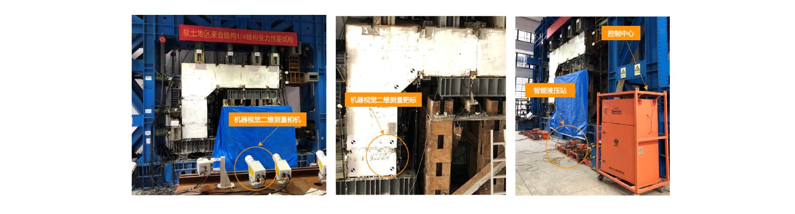 软土地区束合结构1/4结构试验搭载6套智能液压站、4套机器视觉二维测量系统,完成了试验多工况加载持荷的同时,并通过机器视觉二维测量系统测量结构物指定23个测点的位移变化,成功地模拟了结构物收敛变形状态。