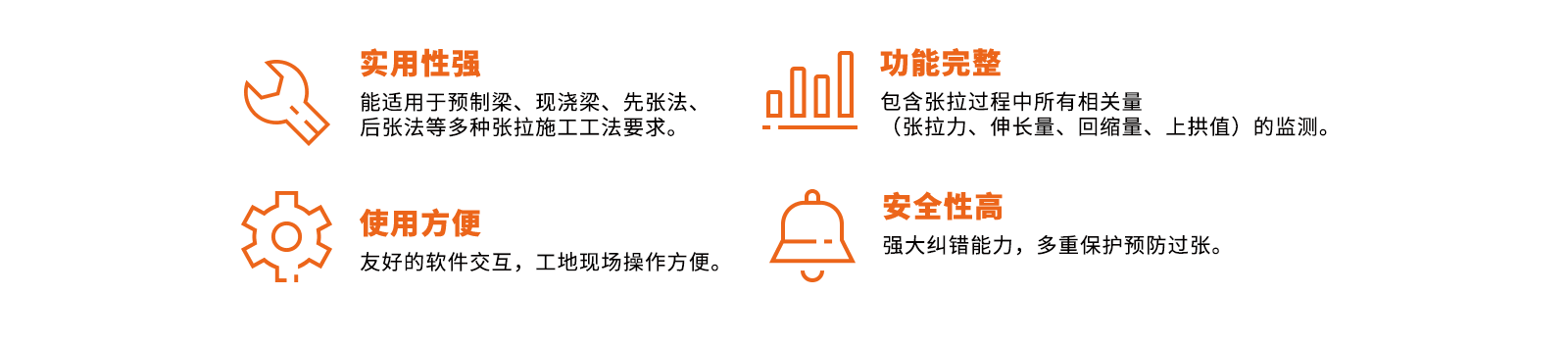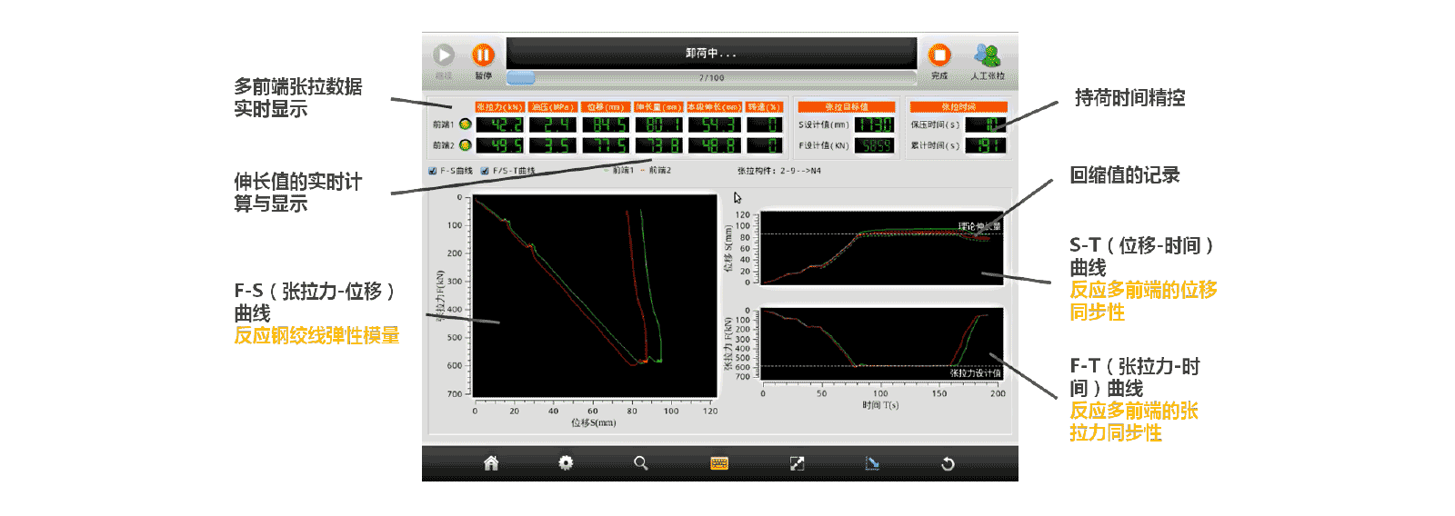 系统的硬件包括工业级平板电脑和数控油泵,工业级平板电脑安装有程控软件系统,具有多前端张拉数据实时显示、张拉全过程数据记录、容错纠错能力强的特点。数控泵站可以灵活适配各种型号的千斤顶,测量系统也配合不同施工形式的需求进行扩充。